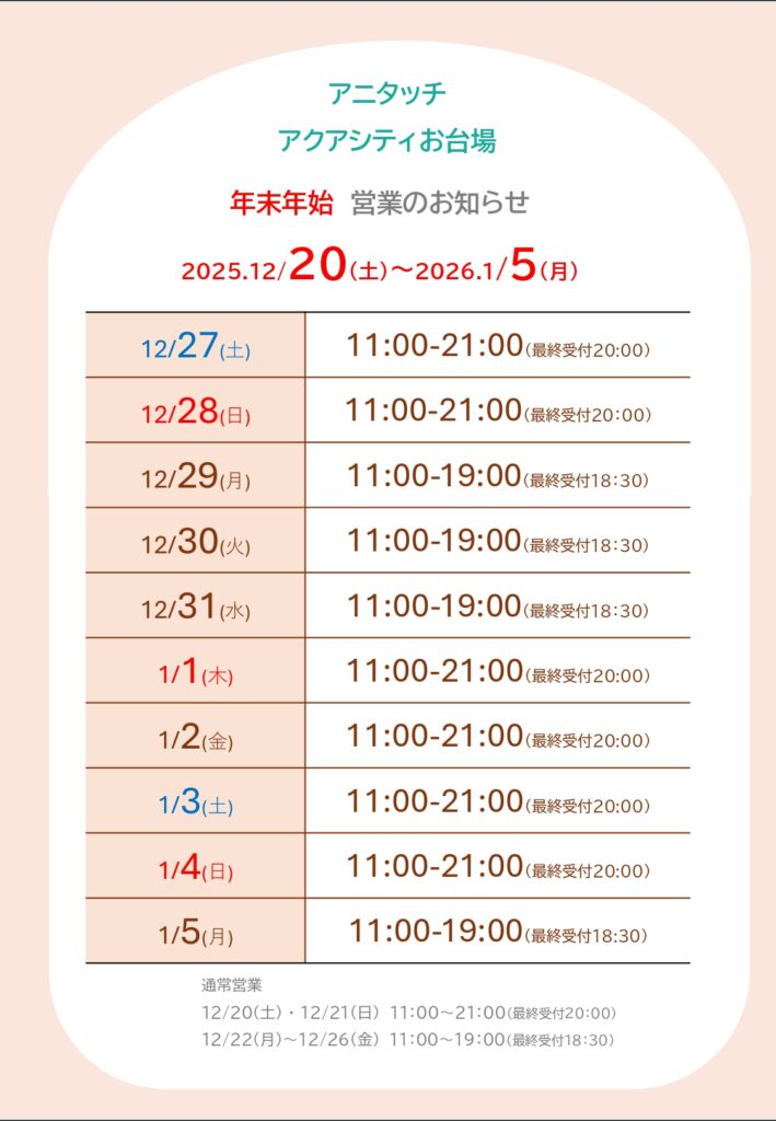 20日・21日・27日・28日 11:00〜21:00(最終受付20:00)
